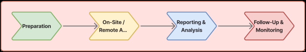 | On-Site / Remote Audit | Inspect facilities/offices; Interview staff; Verify documentation; Observe operations. |